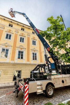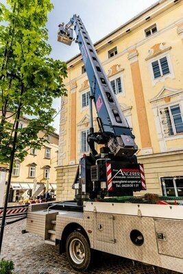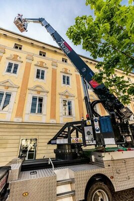 Gerne können Sie unseren LKW mit Kran bzw. Steiger auch anmieten, z. B. für Baumschnitt!